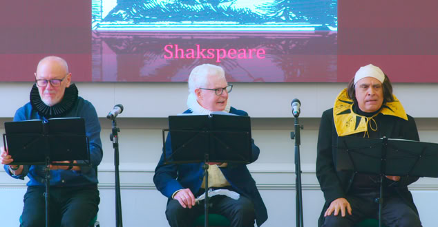 Click the photo to the right to see a staged reading of SHAKESPEARACY, the play included in Appendix 3, as read by actors Sir Derek Jacobi, Richard Clifford and Ron Destro. London, October, 2025.